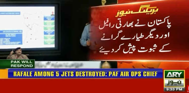 ڈی جی آئی ایس پی آر لیفٹیننٹ جنرل احمد شریف چوہدری نے ایئرفورس اور نیوی کے اعلیٰ افسران کے ہمراہ انٹرنیشنل میڈیا کے ساتھ پریس کانفرنس کے دوران پاک فضائیہ کی جانب سےگرائے جانے والے رافیل طیارے کی ریڈیوچیٹ بھی پیش کر دی۔