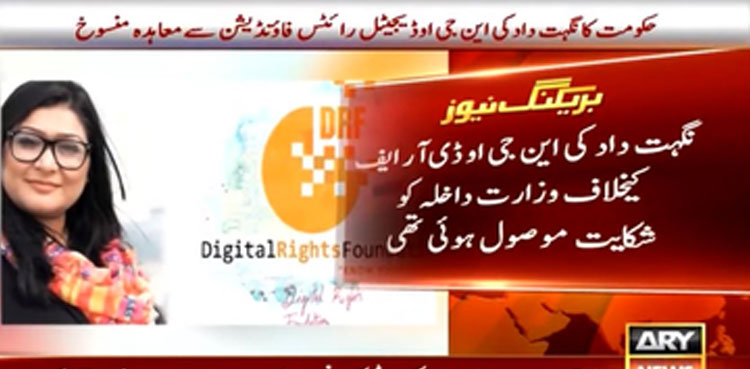 اسلام آباد : حکومت پاکستان نے نگہت داد کی این جی او ڈیجیٹل رائٹس فاؤنڈیشن سےمعاہدہ منسوخ کردیا ، نگہت دادکی این جی اوپر پاکستان مخالف اداروں سے فارن فنڈنگ لینے کا الزام تھا۔
