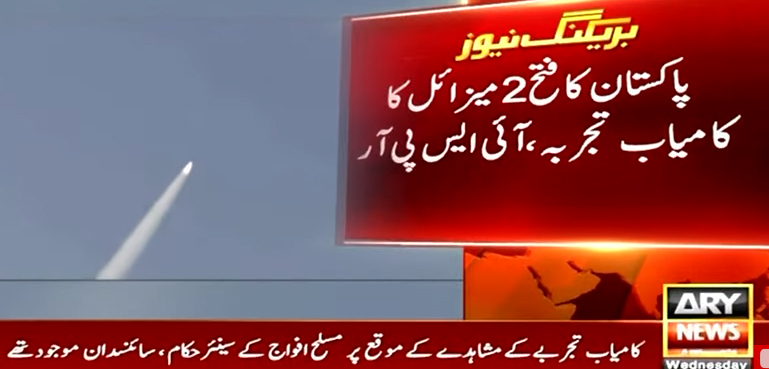 آئی ایس پی آر کے مطابق پاکستان نے فتح 2 میزائل تجربہ کیا ہے۔ یہ میزائل 400 کلومیٹر تک ہدف کو نشانہ بنانے کی صلاحیت رکھتا ہے اور اس تجربے میں مختلف پیرا میٹرز کو چیک کیا گیا۔