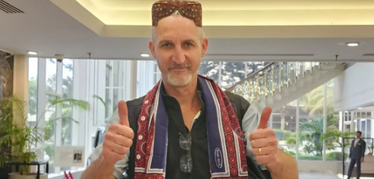 ریڈ بال ٹیم ہیڈ کوچ کا کراچی پہنچنے پر پرتپاک استقبال کیا گیا اور انہیں سندھ کے روایتی تحائف ٹوپی اور اجرک پیش کی گئی۔