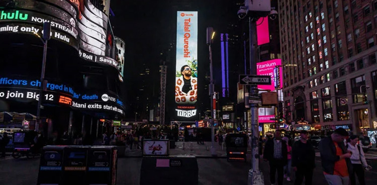 پاکستان سے تعلق رکھنے والے موسیقار طلال قریشی نیویارک کے ٹائمز اسکوائر پر جلوہ گر ہوگئے، ان کے نئے البم ’ٹربو‘ کو اسپاٹی فائی کی جانب سے لانچ کیا جارہا ہے۔