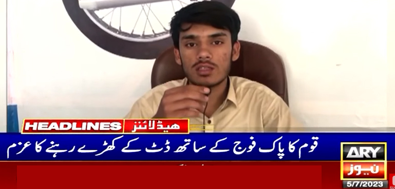 عوام نے کہا کہ ہمیں نہیں لگتا کہ لوگ پاک فوج کے خلاف جائیں گے۔ ہمارے افسروں نے بہت اچھی بات کہی ہے، چیئرمین پی ٹی آئی کو ایسے نہیں کرنا چاہیے تھا جیسے ان لوگوں نے کیا ہے، یہ کچھ لوگوں کی سازش کی وجہ سے ہوا ہے اور جو اس کو سپورٹ کرتے ہیں وہ بھی غلط ہیں۔
