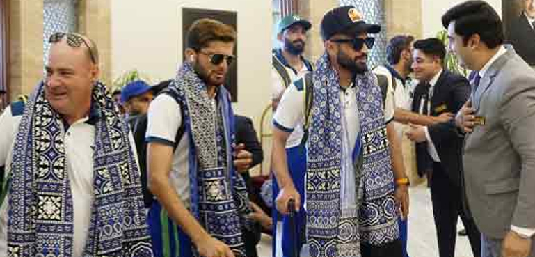 قومی ٹیم بابر اعظم کی قیادت میں ملتان پہنچی جہاں ایئرپورٹ پر ان کا پرتپاک استقبال کیا گیا اور ہوٹل پہنچنے پر ہوٹل انتظامیہ کی جانب سے کھلاڑیوں کو روایتی سرائیکی اجرک کا تحفہ پیش کیا گیا۔