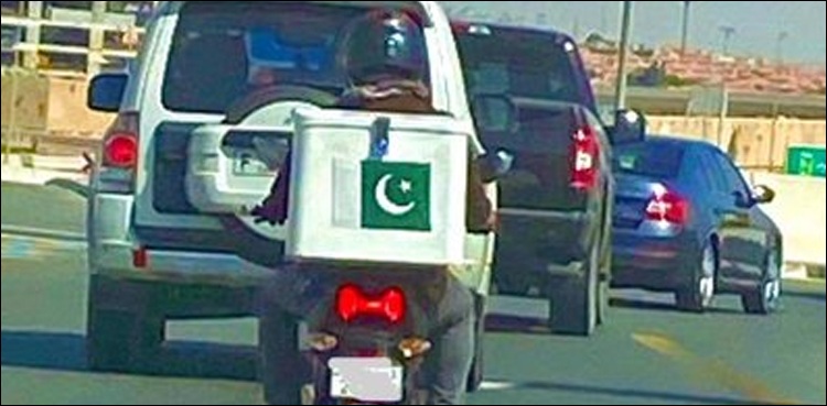Saw this Overseas Pakistani just now working in the heat for a famous home delivery service in Dubai and proudly carrying our Pakistani flag. I love the spirit. He maybe away from his country, home & family but his love for Pakistan shines bright. #PakistanZindabad pic.twitter.com/Bz8bVlJ3Y6