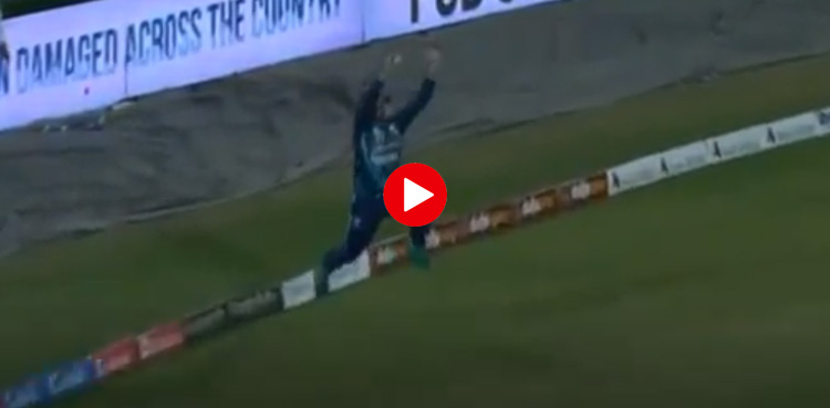 ویڈیو میں دیکھا جاسکتا ہے کہ گیند باؤنڈری لائن سے باہر جارہی ہے لیکن حیدر علی نے کیچ پکڑ کر خود بھی کمال انداز میں بیلنس کیا اور فال سالٹ کی وکٹ حاصل کی۔