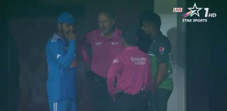 بھارت کی اننگز ختم ہوتے ہی بارش شروع ہوگئی جس کا سلسلہ تاحال جاری ہے، گراؤنڈ کو کوورز سے ڈھک دیا گیا ہے اور دوسری اننگز تاخیر کا شکار ہے۔