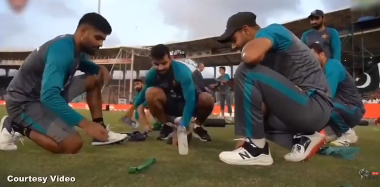 سوشل میڈیا پر زیر گردش ویڈیو میں دیکھا جاسکتا ہے کہ بابر اعظم دیگر کھلاڑیوں کے ساتھ اسٹیڈیم میں ’بوتل فلپنگ چیلنج‘ پورا کررہے ہیں۔