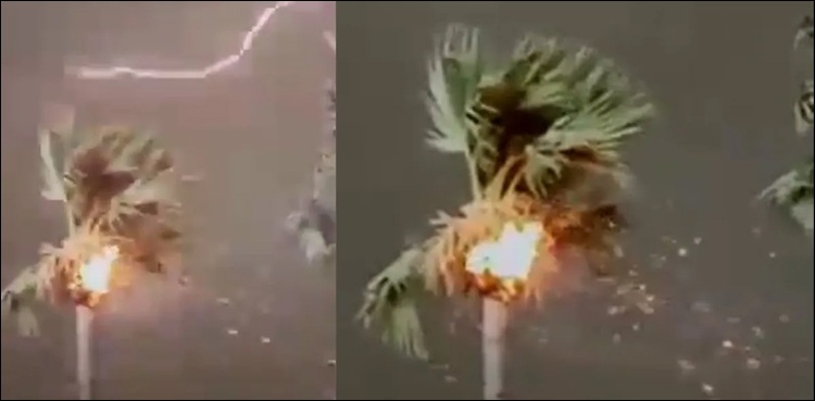 غیرملکی خبررساں ادارے کی رپورٹ کے مطابق آسمانی بجلی بھارتی ریاست بہار کے شہر دھربنگا کے علاقے جھیلے میں لگے ناریل کے درخت پر گری، مقامی شہری نے خوفناک منظر کی موبائل کے ذریعے فلم بندی کرلی۔