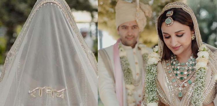 تاہم پرینیتی چوپڑا کی شادی کے جوڑے میں سب سے زیادہ جو چیز مداحوں کو اچھی لگی وہ تھا ان کا دوپٹہ جس کے اوپر کڑھائی سے ’ہندی زبان‘ میں ان کے شوہر ’راگھو چڈھا‘ کا نام لکھا ہوا تھا۔