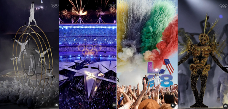 اختتامی تقریب پیرس کے اولمپک اسکواڈ کے نیچے شروع ہوئی، جو ایک غبارے سے لٹکی ہوئی تھی، جس میں بجلی اور ایل ای ڈی اسپاٹ لائٹس سے بنی ایک ڈرامائی آگ لگی ہوئی تھی۔
