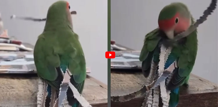 ویڈیو میں دیکھا جاسکتا ہے کہ طوطا میز پر پڑے کاغذ کے ٹکڑوں کو یکے بعد دیگرے ایسی مہارت کے ساتھ اپنی پروں میں پیوست کرتا ہے، جسے دیکھ کر عقل دنگ رہ جاتی ہے، یہ کارنامہ سرانجام دینے کے بعد وہ دیوانہ وار گھومتا ہے اور خود کو مور سمجھنے لگتا ہے۔