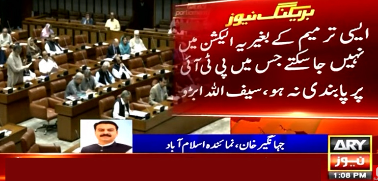 اس موقع پر پی ٹی آئی سینیٹر سیف اللہ ابڑو نے کہا کہ ایسی ترمیم کے بغیر یہ الیکشن میں نہیں جا سکتے جس میں پی ٹی آئی پر پابندی نہ ہو کیا آپ کو لگتا ہے کہ آپ ایسے الیکشن جیت جائیں گے۔