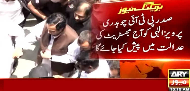 اے آر وائی نیوز کے مطابق پاکستان تحریک انصاف کے مرکزی صدر اور سابق وزیر اعلیٰ پنجاب چوہدری پرویز الہٰی کو آج ضلع کچہری میں ڈیوٹی مجسٹریٹ کے سامنے پیش کیا جائے گا۔ انہیں اینٹی کرپشن ڈائریکٹوریٹ سے ضلع کچہری بکتر بند میں لے جایا جائے گا جب کہ اینٹی کرپشن حکام عدالت سے ان کے ریمانڈ کی استدعا کریں گے۔