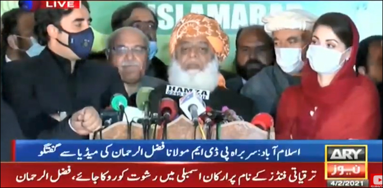 مولانا فضل الرحمان کا کہنا تھا کہ ایوانوں میں ہمارے احتجاج کا سلسلہ بدستور جاری رہے گا اور ہم اپنی آواز بلند کرتے رہیں گے۔ ایک سوال کا جواب دیتے ہوئے مولانا فضل الرحمان کا کہنا تھا کہ’سینیٹ الیکشن ہوجانےدیں پھراستعفوں کاجواب بھی مل جائے گا، ہم نے کبھی روالپنڈی میں فیلڈ کا اعلان نہیں کیا بلکہ اسلام آباد اور راولپنڈی کا نام لیا تھا‘۔ استعفوں کے سوال پر مریم نواز نے صحافیوں کو حوصلہ کرنے کا مشورہ دیا۔