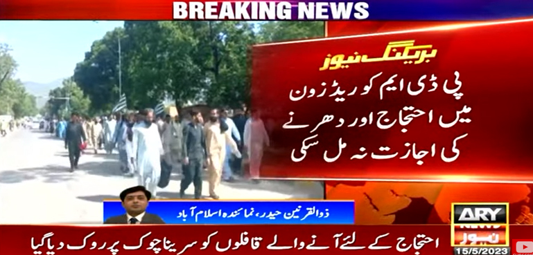 اے آر وائی نیوز کے مطابق اسلام آباد میں دفعہ 144 نافذ ہے اس کے باوجود پی ڈی ایم سربراہ آج سپریم کورٹ کے خلاف ریڈ زون میں احتجاج اور دھرنے کے فیصلے پر قائم ہیں تاہم انتظامیہ نے پی ڈی ایم کو آج ریڈ زون میں احتجاج اور دھرنے کی اجازت نہیں دی ہے اور پولیس نے ریڈ زون جانے والے تمام راستے بند کر دیے ہیں۔