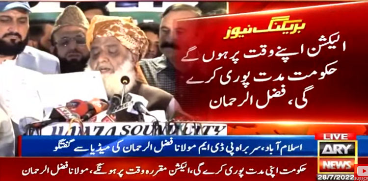 اسلام آباد: پاکستان ڈیمو کریٹک موومنٹ (پی ڈی ایم) کے سربراہ مولانا فضل الرحمان کا کہنا ہے کہ الیکشن مقررہ وقت پر ہوں گے اور حکومت اپنی مدت پوری کرے گی۔