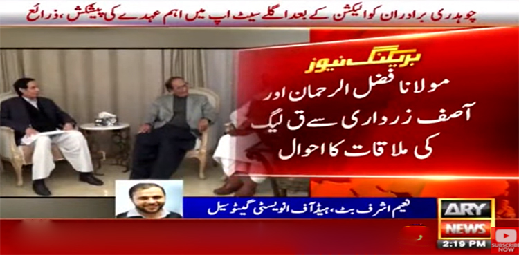 ذرائع کے مطابق مولانا فضل الرحمان نے چوہدری برادران کو بجٹ تک وزارت اعلیٰ اور پھر الیکشن کی پیشکش کی، ساتھ ہی الیکشن کے بعد اگلے سیٹ اپ میں اہم عہدے کی پیشکش کی گئی ہے۔