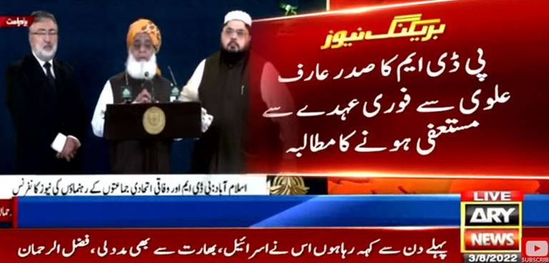 اے آر وائی نیوز کے مطابق حکومتی اتحاد پی ڈی ایم کے اجلاس کے بعد سربراہ پاکستان ڈیموکریٹک موومنٹ مولانا فضل الرحمٰن نے دیگر رہنماؤں کے ہمراہ مشترکہ پریس کانفرنس کرتے ہوئے مطالبہ کیا ہے کہ عمران خان ہوں یا عارف علوی فوری طور پر پارٹی اور صدارت سے استعفیٰ دیں۔