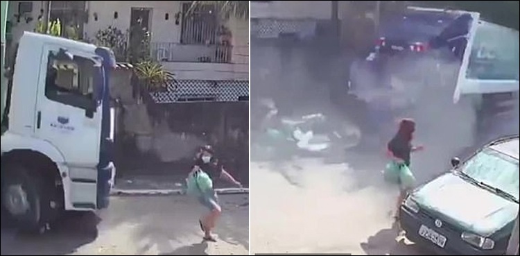 سی سی ٹی وی فوٹیج میں دیکھا جاسکتا ہے کہ تیز رفتار ٹرالر کی زد میں آتے ہوئے ایک خاتون بھی بچ گئیں جنہوں نے بھاگ کر اپنی جان بچائی۔