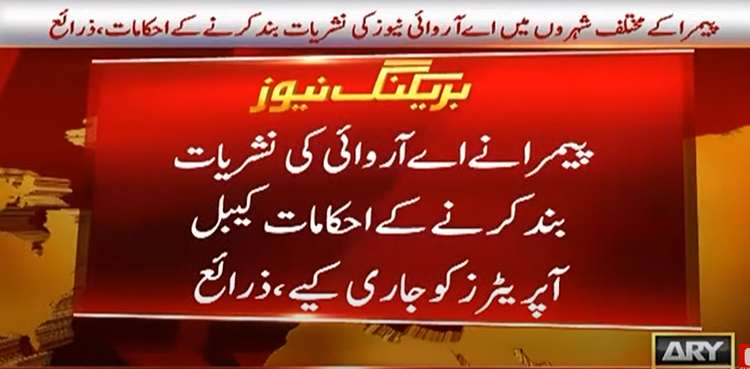 اے آر وائی نیوز رپورٹ کے مطابق پیمرا نے کیبل آپریٹرز کو اے آر وائی کی نشریات بند کرنے کے احکامات جاری کیے ہیں، جس کے بعد کراچی، اسلام آباد، لاہور اور راولپنڈی سمیت کئی شہروں میں نشریات بند ہونا شروع ہوگئی ہیں۔
