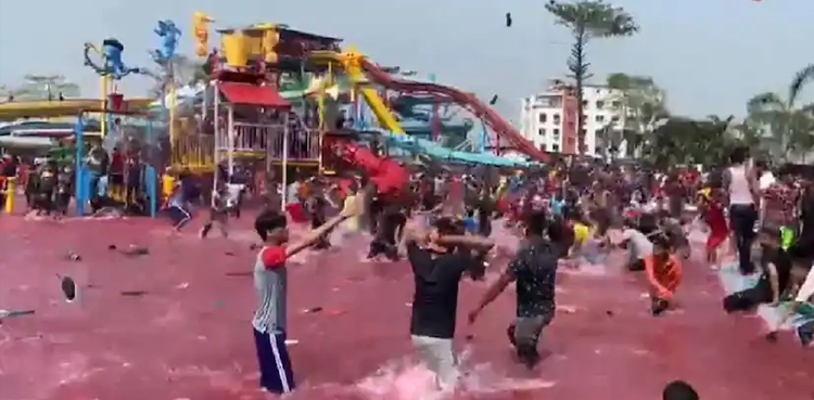ہولی کی تقریب میں لوگوں نے ایک دوسرے پر رنگ اڑانے کے بجائے چپلوں کی بارش کر دی۔ ویڈیو میں دیکھا جا سکتا ہے کہ لوگوں کی بڑی تعداد واٹر پارک میں جمع ہے اور وہ گلابی رنگ کے پانی میں ہولی کھیل رہے ہیں۔