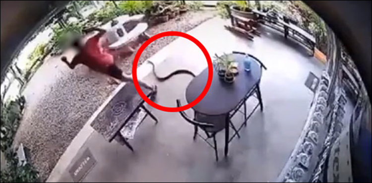 تھائی لینڈ کے شہری نے سانپ کے ڈسنے سے بچنے کے لیے دوڑ لگادی اور چند سیکنڈوں کے فرق سے وہ سانپ کے حملے سے بچ گیا اور سانپ تیزی سے دوسری جانب چلا گیا۔