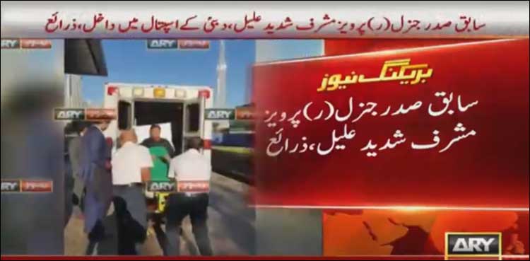 تفصیلات کے مطابق سابق صدر اور ریٹائرڈ جنرل پرویز مشرف کے بارے میں اطلاع ہے کہ انھیں شدید علالت کی حالت میں دبئی کے ایک اسپتال منتقل کر دیا گیا ہے۔