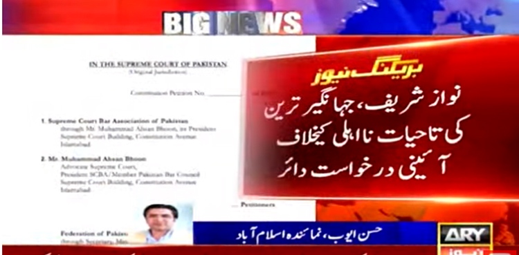 اسلام آباد : سپریم کورٹ میں سابق وزیراعظم نواز شریف اور جہانگیر ترین کی تاحیات نا اہلی کیخلاف آئینی درخواست دائر کردی گئی ۔