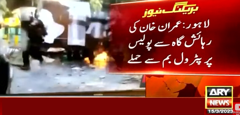 عمران خان کی گرفتاری کے لیے زمان پارک میں جاری آپریشن کے دوران پی ٹی آئی چیئرمین کے گھر سے پولیس پر پٹرول بم سے حملے کیے گئے ہیں۔