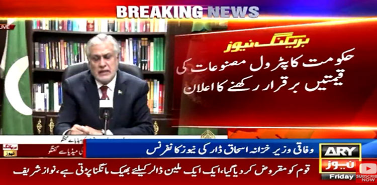تفصیلات کے مطابق نیوز کانفرنس کرتے ہوئے وزیر خزانہ اسحق ڈار نے یٹرول اورڈیزل کی قیمتیں برقرار رکھنے کا اعلان کیا، انہوں نے بتایا کہ پیٹرول اورڈیزل کی قیمتیں15اپریل تک برقراررہیں گی۔