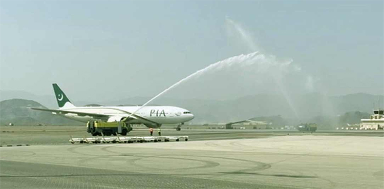 تفصیلات کے مطابق پی آئی اےکی پہلی پرواز پشاور سے 168مسافر لےکر دوپہر کو فجیرہ پہنچی تو ایئرپورٹ پر ‏روایتی استقبال کرتے ہوئے طیارے کو واٹرکینن سیلوٹ پیش کیا گیا۔