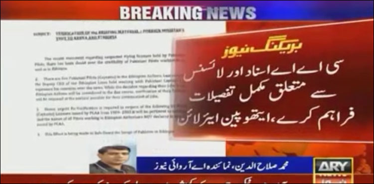 ایتھوپین ائیرلائن انتظامیہ نے وزارت خارجہ اور سی اے اے حکام کو خط لکھا ، جس میں کہا گیا ہے کہ پاکستانی پائلٹوں کے مشتبہ لائسنسز نے دنیا بھر کی طرح ایتھوپیا میں بھی تشویش پیدا ہوئی ، ایتھوپین ائیرلائن میں 5 پاکستانی پائلٹ کام کررہے ہیں۔