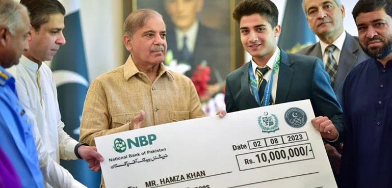 وزیراعظم شہباز شریف 37 سال بعد پاکستان کو جونیئر اسکواش کا چیمپئن بنانے والے حمزہ خان کو ایک کروڑ روپے کا انعامی چیک دے دیا۔