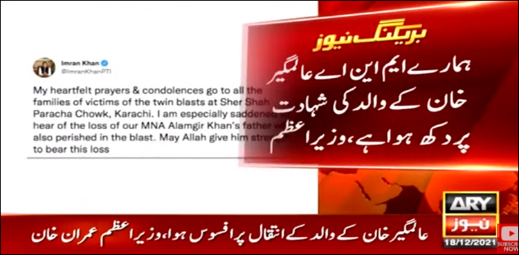 اے آر وائی نیوز کے مطابق وزیراعظم عمران خان نے سماجی رابطے کی ویب سائٹ ٹویٹر پر شیر شاہ دھماکے پر اظہار افسوس کیا۔