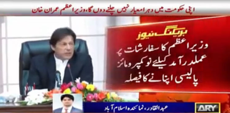 اسلام آباد : وزیراعظم عمران خان نے چیئرمین ایف بی آر پر خفگی کااظہار کرتے ہوئے کہا یہ کسی کےباپ کا نہیں عوام کا ملک ہے، اپنی حکومت میں دہرا معیار نہیں چلنے دوں گا۔