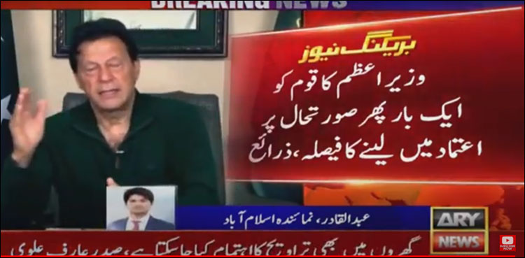 تفصیلات کے مطابق وزیر اعظم عمران خان نے قوم کو ایک بار پھرصورتحال پر اعتمادمیں لینےکافیصلہ کرلیا ، ذرائع کا کہنا ہے چیئرمین سیکرٹریٹ بنی گالہ میں آج سہ پہر اجلاس ہو گا، جس میں وزیر اعظم کےقوم سے خطاب کے نکات پر مشاورت ہوگی۔