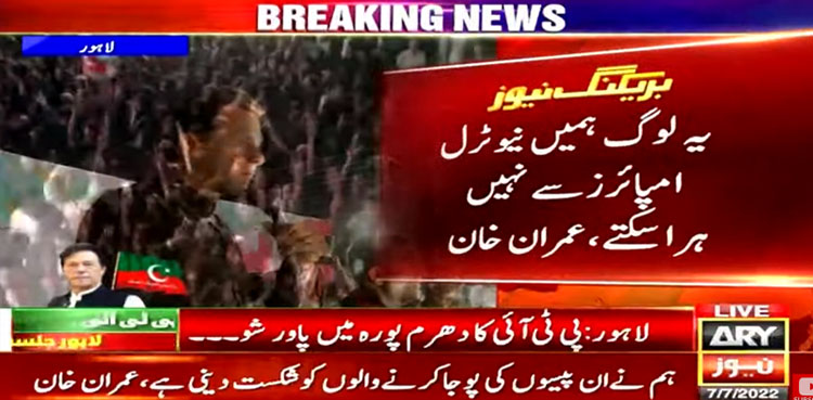 اے آر وائی نیوز کے مطابق چیئرمین پی ٹی آئی عمران خان نے دھرم پورہ میں انتخابی جلسے سے خطاب کرتے ہوئے کہا کہ یہ امپائرز کو ساتھ ملا کرشکست دینےکی کوشش کریں گے لیکن یہ ہمیں نیوٹرل امپائرز سے نہیں ہرا سکتے۔