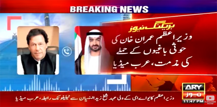 عرب میڈیا کے مطابق وزیراعظم عمران خان نے یو اے ای کے ولی عہد شیخ زید النہیان سے ٹیلفونک رابطہ کیا ہے جس میں انہوں نے گزشتہ روز ابوظہبی میں ہونے والے حملے کی مذمت کی۔