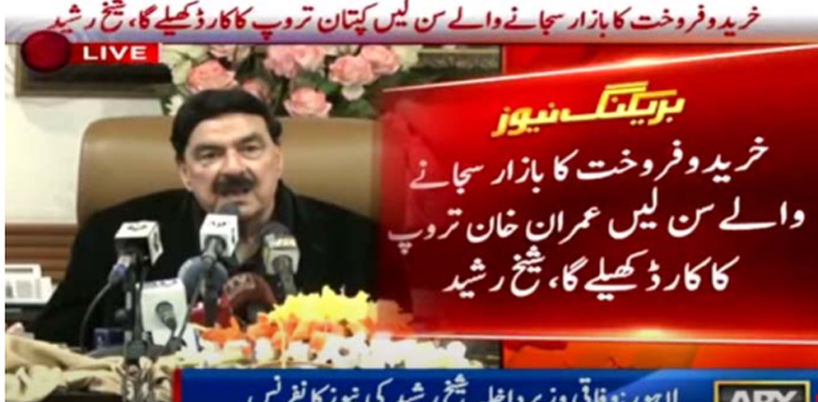 شیخ رشید کا کہنا تھا کہ خرید وفروخت کا بازار سجانے والے سن لیں عمران خان تروپ کا کارڈ کھیلے گا، سال رہ گیا ہے الیکشن کی تیاری کرنی چاہیے، 172لوگوں کو خریدنا ہے ،نوازشریف نے خرید و فروخت کا اختیار آصف زرداری کودیا ہے۔