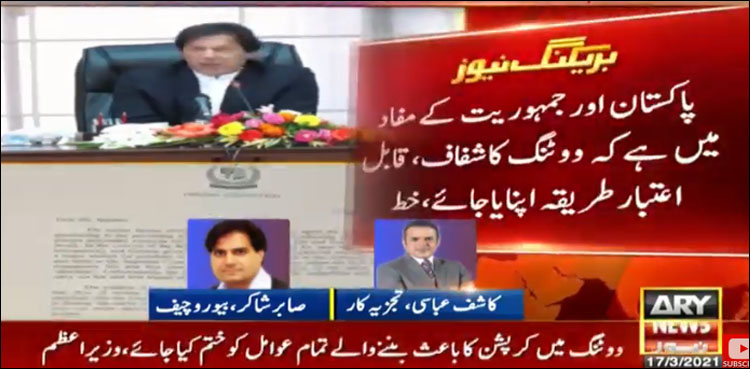 اے آر وائی نیوز کی رپورٹ کے مطابق وزیراعظم عمران خان نے اسپیکر قومی اسمبلی اسد قیصر کو خط لکھا جس میں اسپیکر سے درخواست کی گئی ہے کہ شفاف انتخابات کے لیے پارلیمانی کمیٹی قائم کی جائے۔