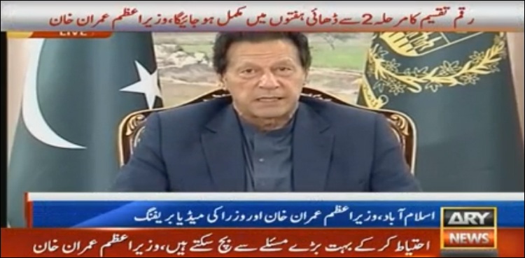 اسلام آباد: وزیراعظم عمران خان نے کہا ہے کہ کل سے ایک کروڑ 20 لاکھ خاندانوں میں 12 ہزار فی کس رقم تقسیم ہوگی، رقم تقسیم کا مرحلہ 2 سے ڈھائی ہفتوں میں مکمل ہوجائے گا۔