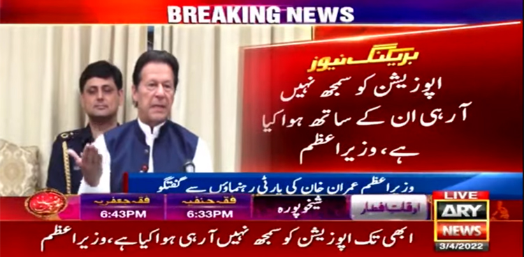 پارٹی رہنماؤں سے خطاب کرتے ہوئے وزیر اعظم عمران خان نے کہا کہ کل شام کو آپ سب کو کہنا پڑا تھا گھبرانا نہیں، ابھی تک اپوزیشن کو سمجھ نہیں آ رہی ہوا کیا ہے، نیشنل سکیورٹی کمیٹی نے واضح طور پر کہا ہے کہ اس لیٹر میں بیرونی سازش ہے۔