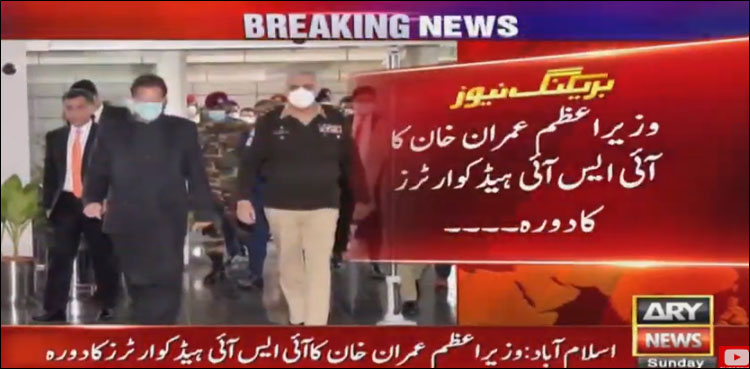 اے آر وائی نیوز کی رپورٹ کے مطابق وزیراعظم عمران خان نے آرمی چیف کے ہمراہ آئی ایس آئی ہیڈ کوارٹر کا دورہ کیا، ڈی جی آئی ایس آئی لیفٹیننٹ جنرل فیض حمید نے وزیراعظم کا استقبال کیا۔