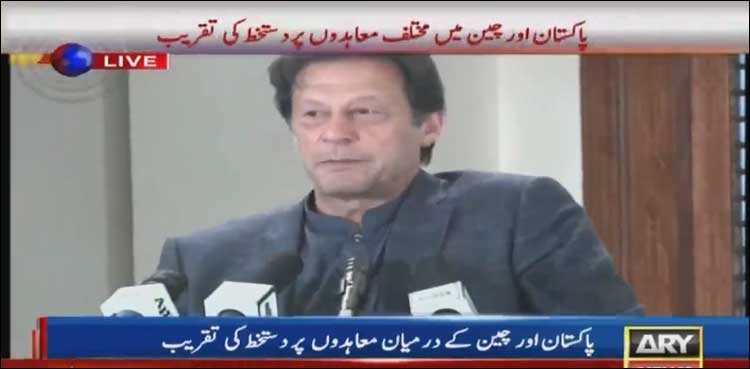 تفصیلات کے مطابق پاکستان اور چین کے درمیان مختلف معاہدوں پر دستخط کی تقریب ہوئی جس میں وزیر اعظم عمران خان بھی شریک ہوئے۔ تقریب سے خطاب کرتے ہوئے وزیر اعظم عمران خان نے کہا کہ آج تین پہلوؤں پر بات کرنا چاہتا ہوں۔