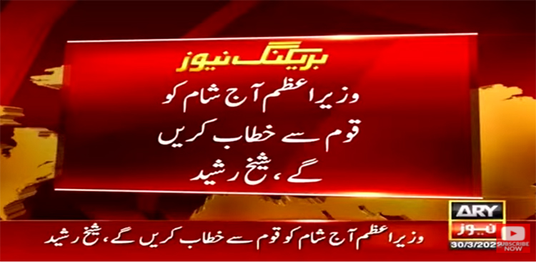 وفاقی وزیر داخلہ شیخ رشید نے اسلام آباد میں صحافیوں سے مختصر گفتگو کرتے ہوئے بتایا کہ وزیراعظم آج شام کو قوم سے خطاب کریں گے جبکہ کابینہ کی ہنگامی میٹنگ بھی طلب کرلی گئی ہے۔