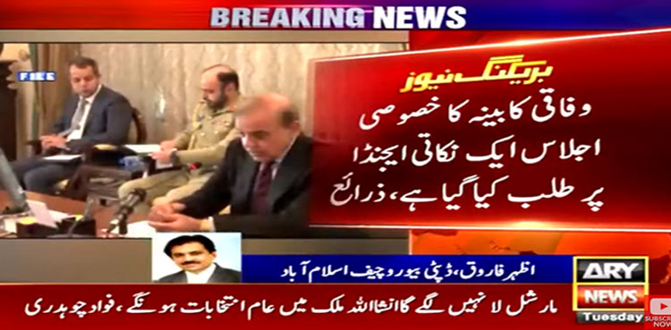 ذرائع کے مطابق وزیراعظم شہباز شریف نے کابینہ کا خصوصی اجلاس جمعرات کو طلب کرلیا ہے، خصوصی اجلاس ایک نکاتی ایجنڈے پر طلب کیا گیا ہے۔