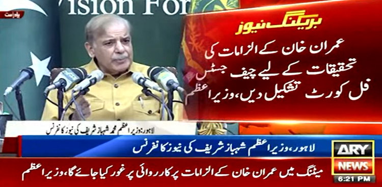 وزیر اعظم شہباز شریف نے مطالبہ کیا ہے کہ عمران خان کے الزامات کی تحقیقات کے لیے چیف جسٹس آف پاکستان فل کورٹ تشکیل دیں۔