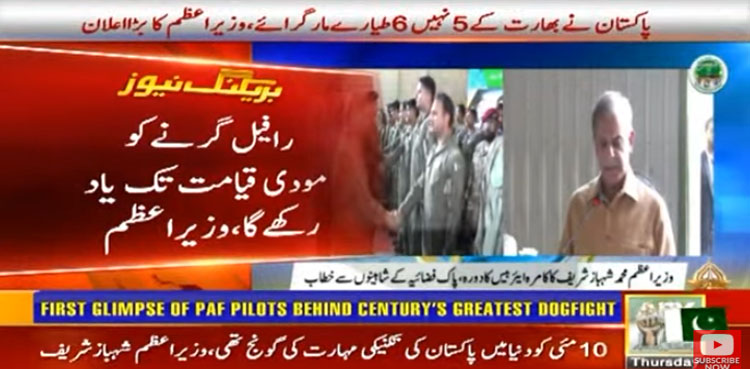 معرکہ حق کے شاہینوں سے خطاب کرتے ہوئے وزیراعظم شہباز شریف نے کہا کہ پاک فضائیہ کے شاہینوں نے دشمنوں کے دانت توڑے، غرور خاک میں ملا دیا، آج قوم کو بلا خوف و تردید بتا سکتا ہوں کہ پاکستان نے 5 نہیں 6 بھارتی طیارے گرائے ہیں۔