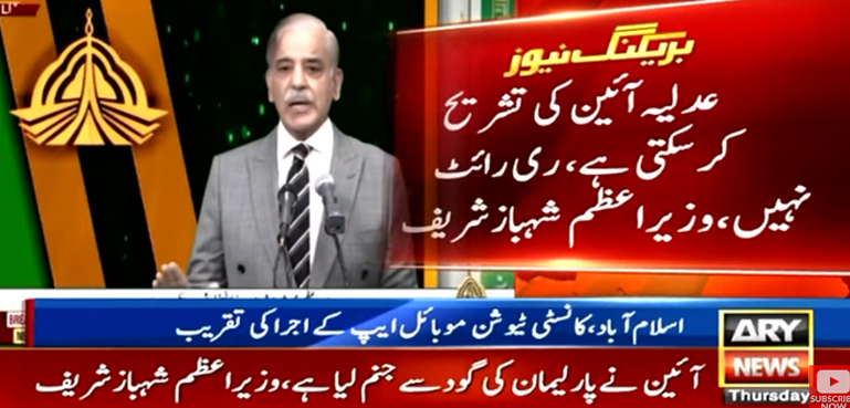 اے آر وائی نیوز کے مطابق وزیراعظم شہباز شریف نے پاکستان ٹیلیویژن سینٹر کے اسلام آباد سینٹر کی عمارت میں آئین پاکستان ڈیجیٹل ایپ کا افتتاح کیا۔ اس موقع پر منعقدہ تقریب سے خطاب کرتے ہوئے کہا کہ خوشی ہے آئین پاکستان کو ڈیجیٹل ٹیکنالوجی میں تبدیل کر دیا گیا۔ موبائل ایپ کے ذریعے اب تمام پاکستانی آئین سے استفادہ کرسکیں گے۔