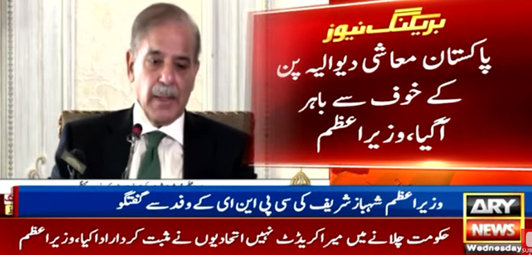 اے آر وائی نیوز کے مطابق وزیراعظم شہباز شریف نے اسلام آباد میں سی پی این ای کے وفد سے گفتگو کرتے ہوئے کہا کہ پاکستان معاشی اور سیاسی طور پر بڑے چیلنجز سے گزر رہا ہے۔ معیشت کو سنبھالنے کے لیے موجودہ حکومت تمام تر کاوشیں بروئے کار لا رہی ہے اور اللہ کا شکر ہے کہ پاکستان پر دیوالیہ ہونے کا خوف ختم ہوچکا ہے۔